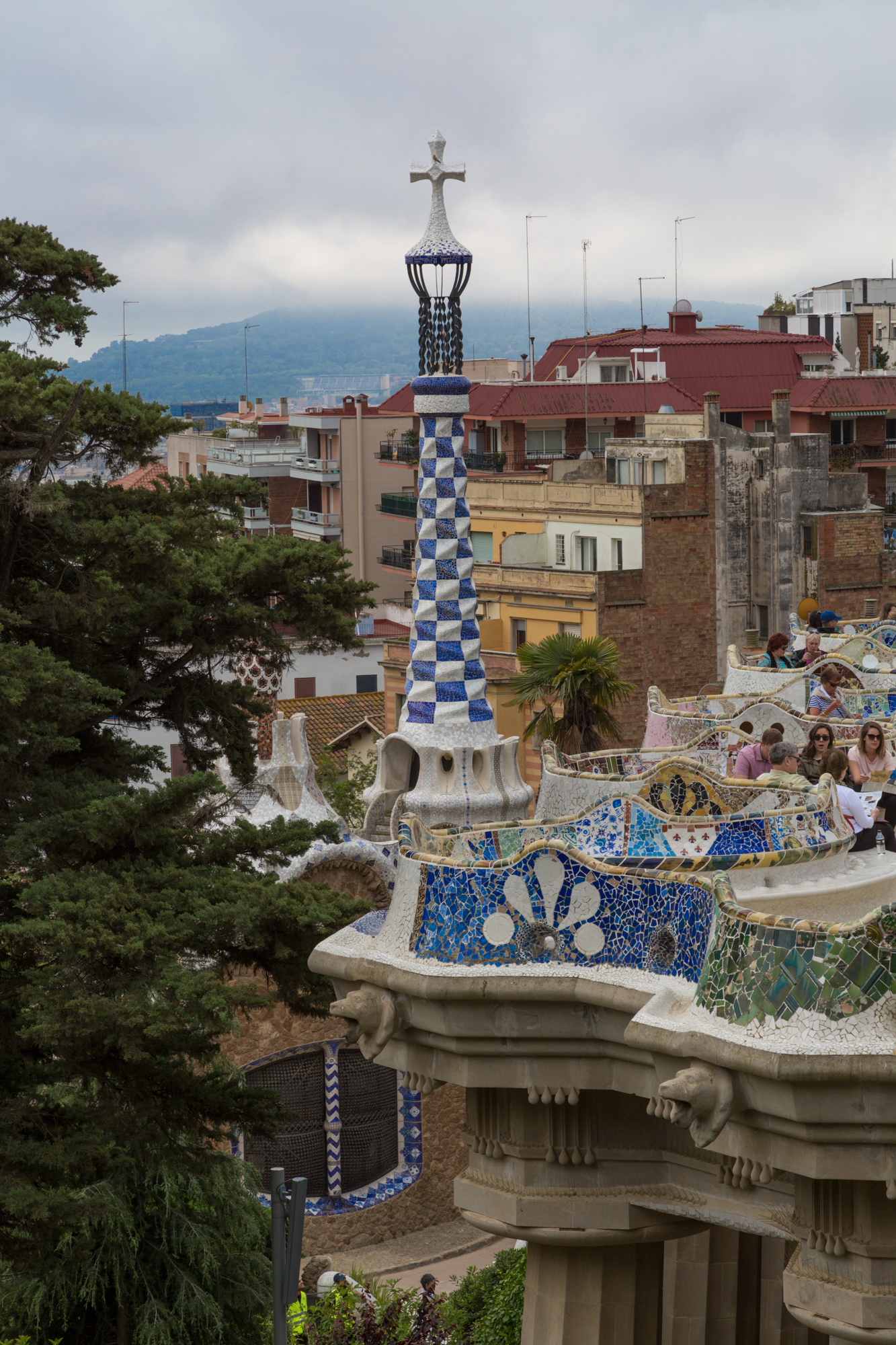 There is no food / water available beyond the ticket office. Most surrounding shops sell “picnic packs” which you can carry inside the park. The park is free to enter but there is a “monument” section which requires a 7€ ticket. There are time restrictions to enter this area and you can only enter at the time printed on your ticket. So, plan your trip to the park accordingly.  You will see Gaudi’s style depicted front and center throughout the park with odd shaped walls, columns, ceramic and glass structures. You get a good view of the city from the hill and most people like to stay there for sunset.