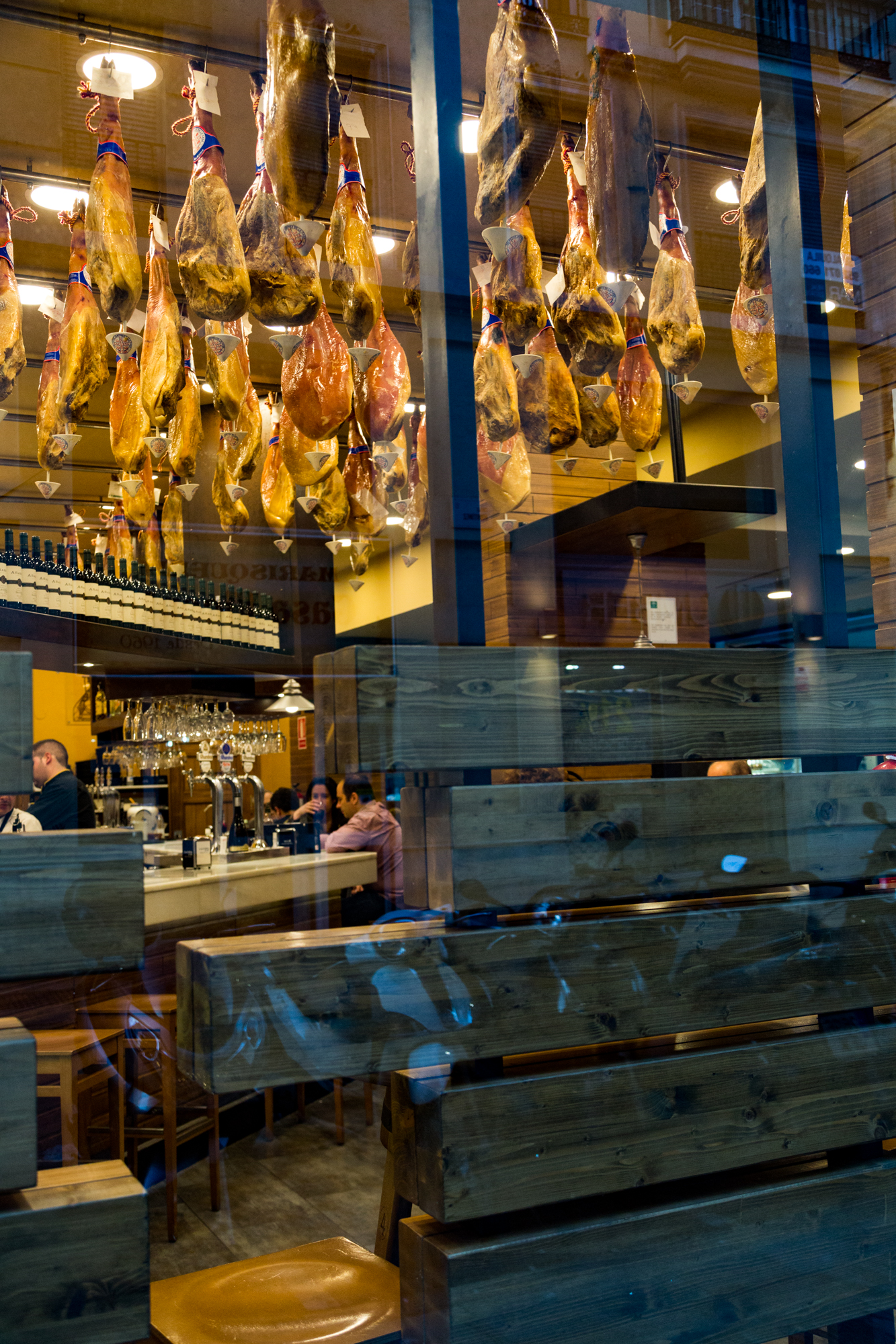 Had Clams and Malaga shrimp at Doramar. Lunch at Garvm was squid ink croquettes, mediterranean spiced tuna with couscous and grilled Octopus. Highly recommend. One day we ate at this Italian place called Mura Mura. It was unique in many ways. The menu was a hand written book with pictures and the bill was written on a slate along with a special thank you note. We ate the Octopus, Burrata and Beef filled Tortellini here. Everything was flavorful. The salt content in the food everywhere in Spain is pretty high for my taste. My palette is used to very little salt so it was hard for me to each a lot. Spain is famous for Iberico ham. It is a common site to see pork legs hanging from the ceiling in markets and restaurants.