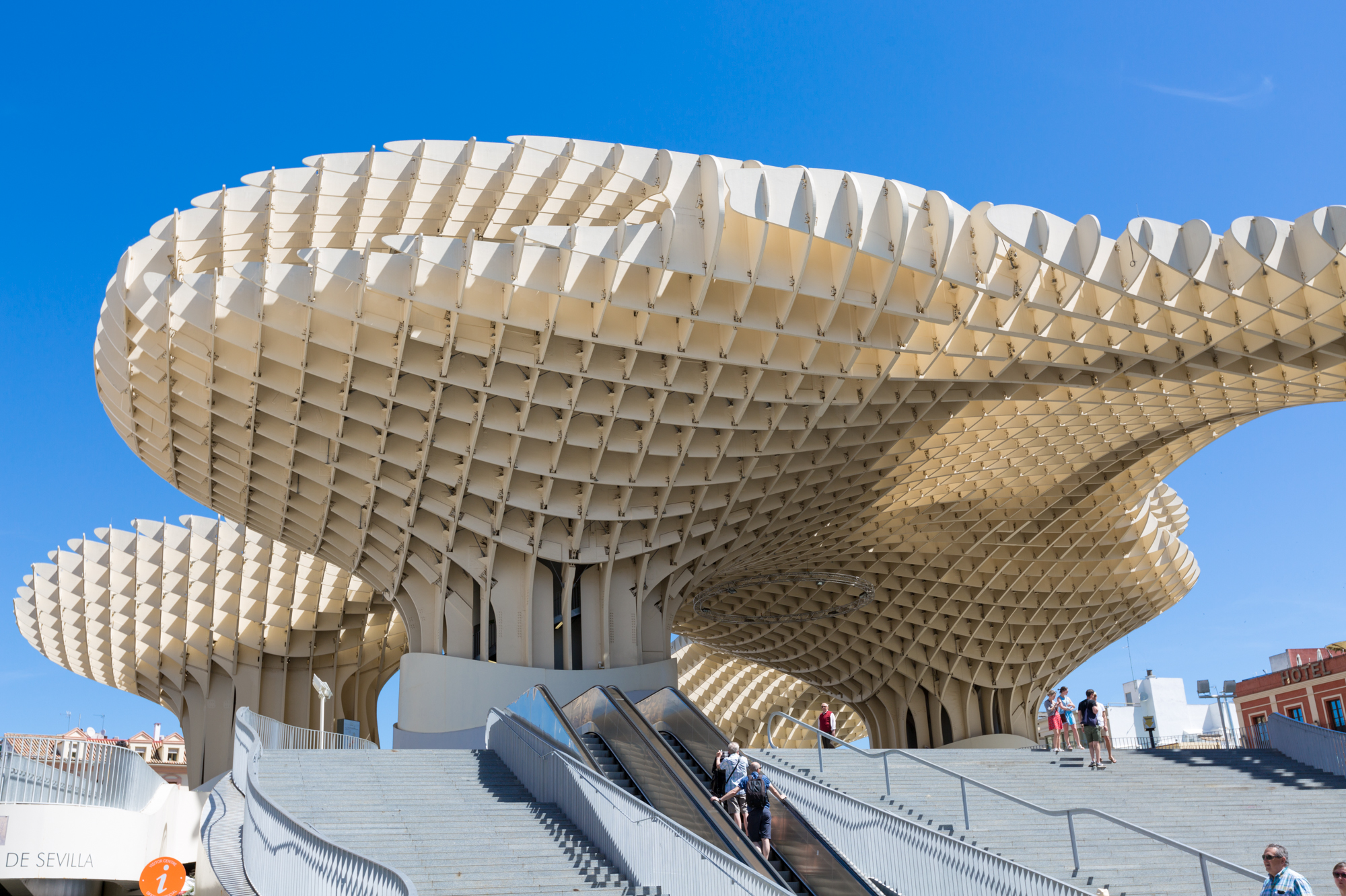 The Metropol Parasol, a wooden architecture located at La Encarnacion Square is a site worth visiting during day and night. It claims to be the largest wooden architecture in the world. It looks like a giant mushroom. It has 4 levels, underground is a museum, street level is the market. Levels above the street are terraces from where you can enjoy views of the city. Plan to go there an hour before sunset and stay after sunset when the lights turn on.