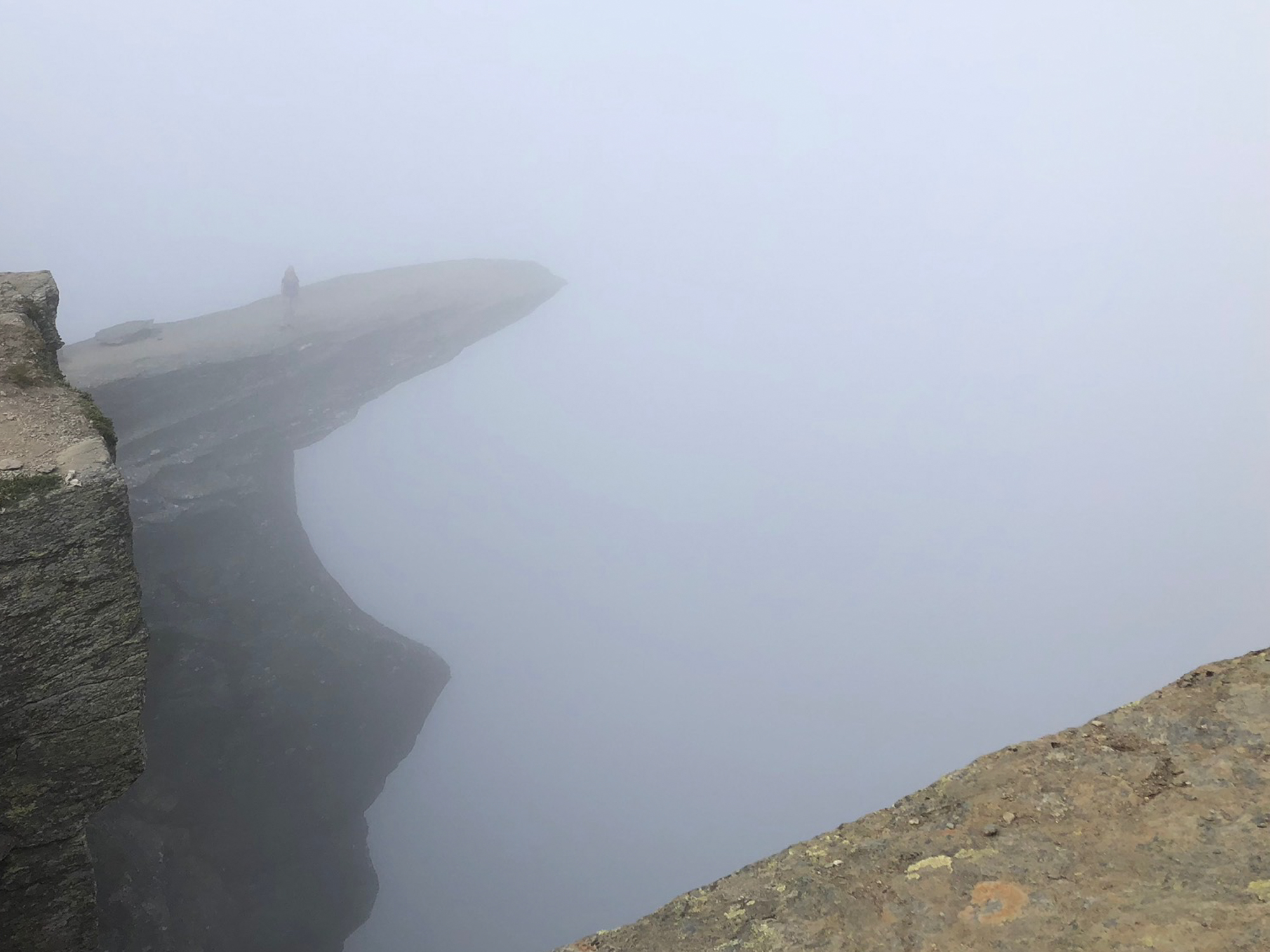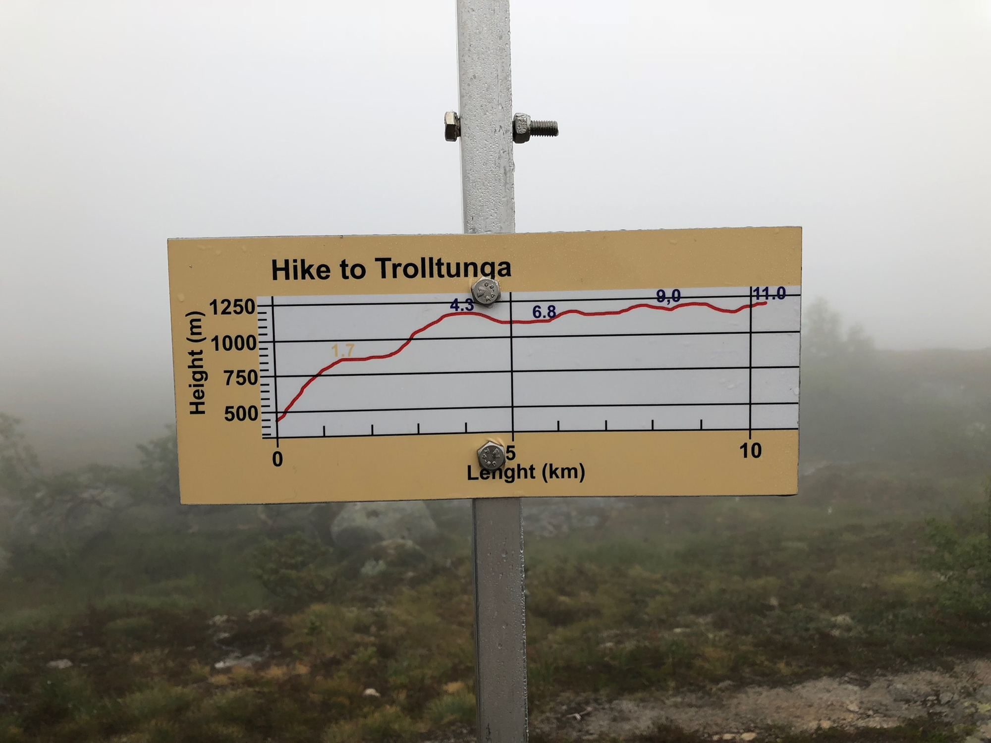 It was a 8 hour hike inclusive of 1.5 hrs break. The fog masked the intensity of the hike but also blocked our views from the summit. The pictures on the 'tongue' / tunga are very foggy and you cannot see the fjord below. Oh well....We did get some good pictures on the way back when the fog cleared.