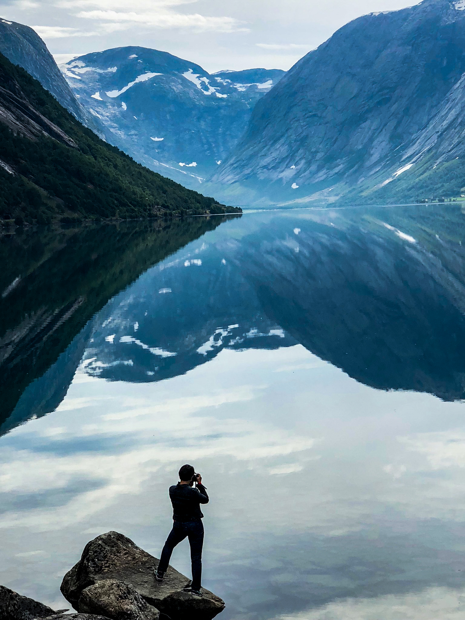 - Chander shot the most iconic photo of the trip with me capturing reflections of mountains in the fjord