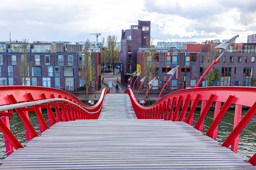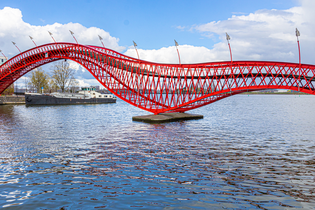 Python Bridge : Its a bright red pedestrian only bridge in the shape of a serpent. Connects Sporenburg and Borneo Island, was built in 2001 and won the International Footbridge Award in 2002