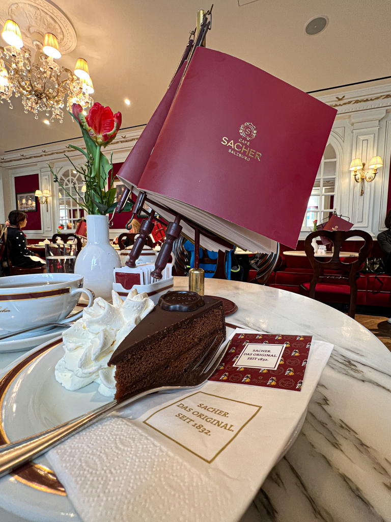 Trip to Salzburg / Austria would not be complete without talking about the Sachertorte, a dense chocolate cake with dark chocolate icing. Chander and I are both dark chocolate lovers. Upon reading great reviews of the Sacher Cafe, we decided to pay a visit and try out the cake. The cafe was very nice but the cake did not live up to the reviews.