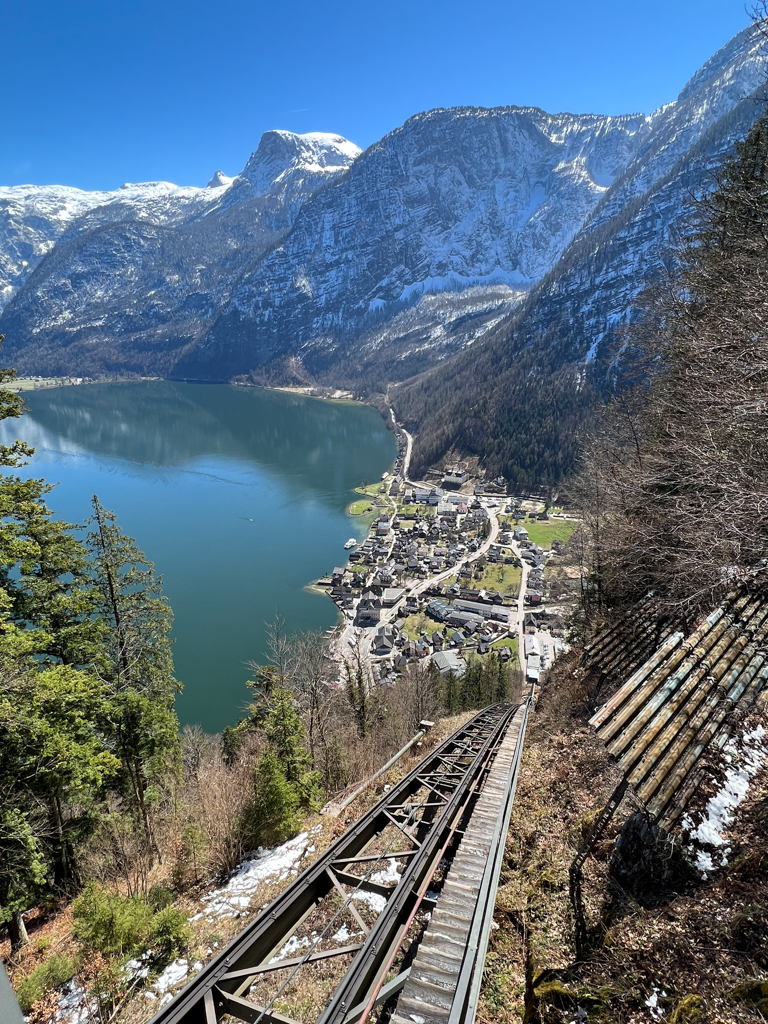 We started our exploration by taking the Salzwelten funicular railway to get to the Hallstat Skywalk viewing platform. The cable car runs every 15 minutes and takes you to the top station in about 2 minutes. You can also hike up the Salzberg.
