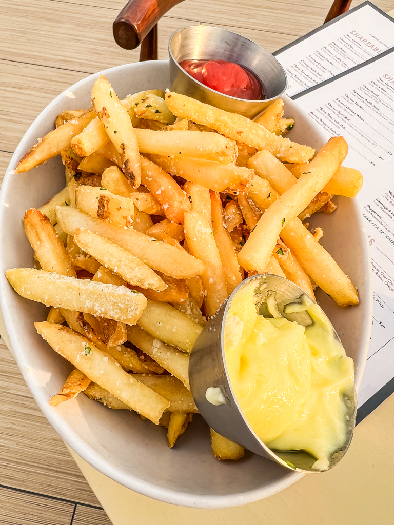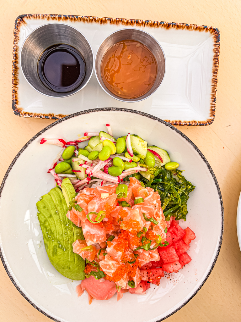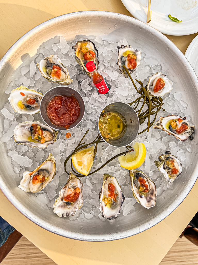 We ordered Dark Side Of the Moon which is a Bourbon based cocktail and a glass of the Pinot Noir. Food order was Oysters, Truffle Fries, Filet Sliders, Tuna Tacos and Salmon Poke Bowl. The cocktail was really good and food was fresh but lacked flavor.