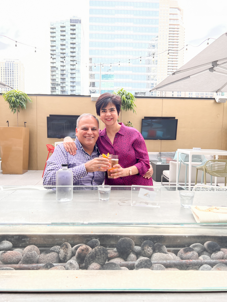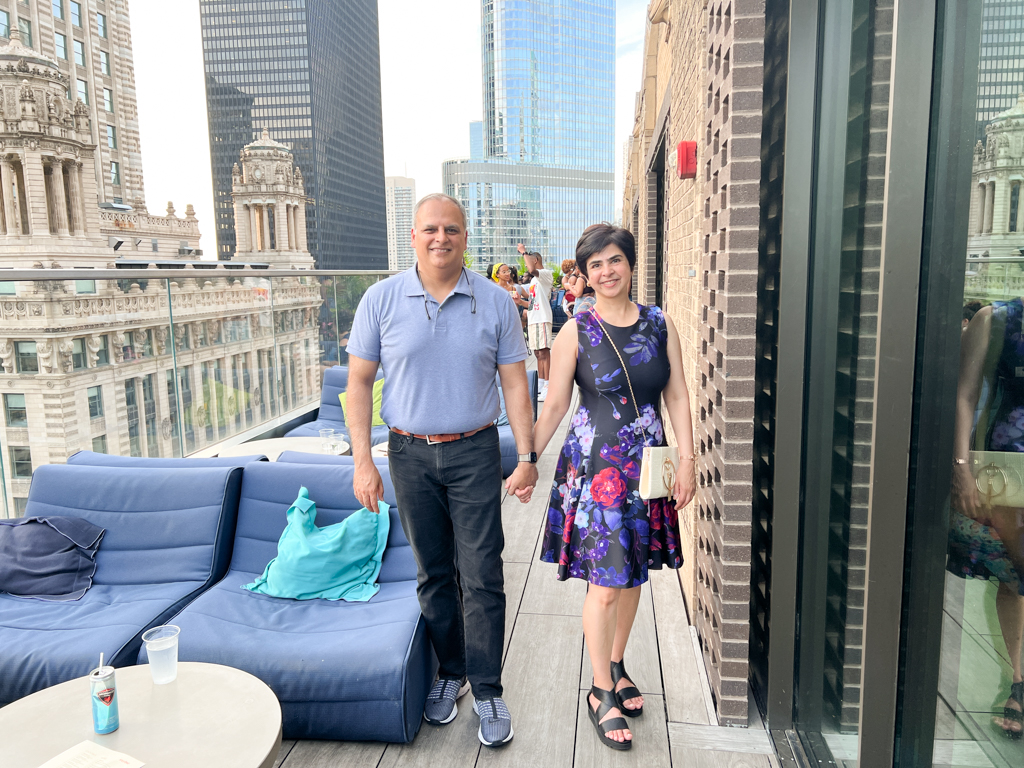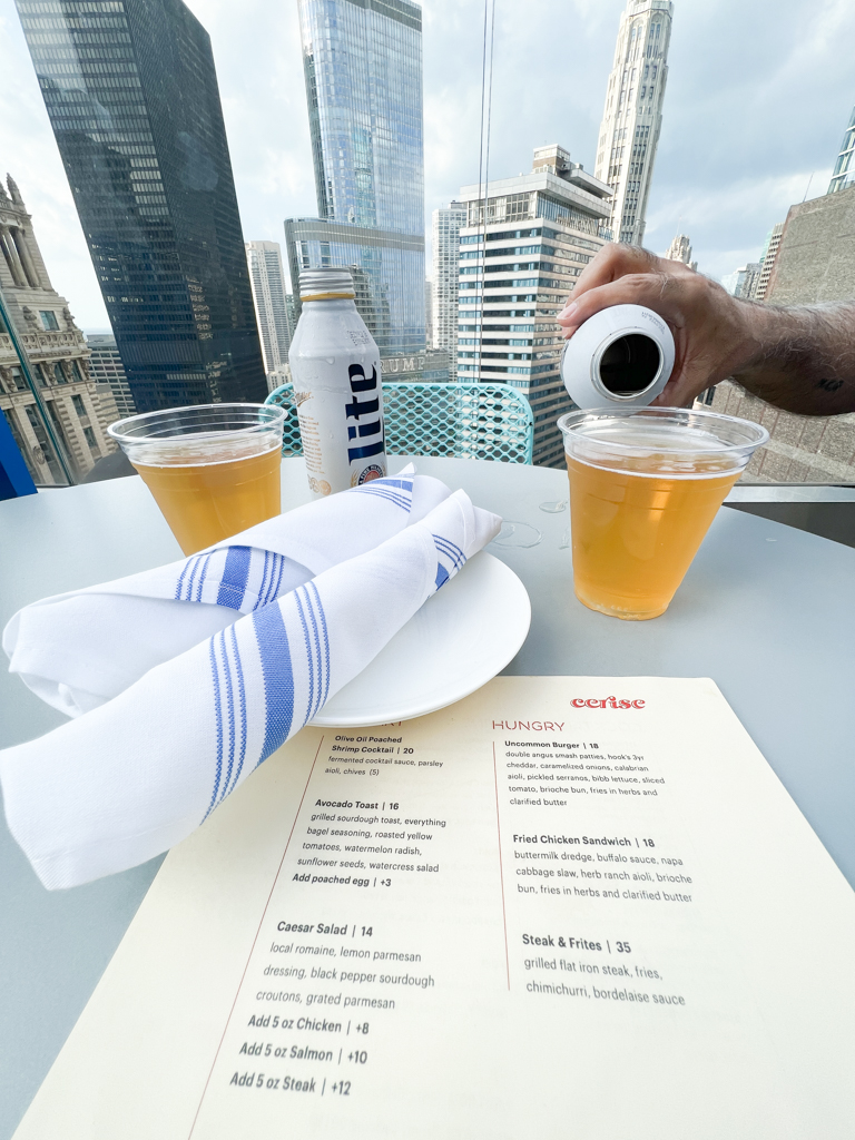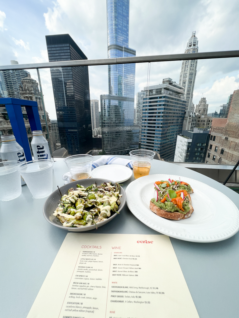 Our next stop was Cerise Rooftop located on the 26th floor of Virgin hotel at 203 N Wabash. This was a hot day. Temperature was 91F, felt like 101F, hot & humid. When we arrived on the 26th floor, we were hit by loud ear-deafening music. Chander and I both like quiet, so we looked at each other and we could read each other’s mind. We did not want to be here. The hostess offered to show us to our table. Chander was ready to turn around and leave but I convinced him to at least check out the table. Our table was outdoors and the music wasn’t as loud. So, we decided to sit there. There was a table reserved for us but a young woman had occupied the seat and refused to get up even though the hostess said the seat was reserved for us. We got another table which in my opinion was a better view.
